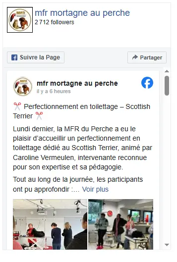 Spécialisée dans les formations liées aux animaux de compagnie, la MFR du Perche est la plus ancienne MFR de Normandie. Créée dans les années 50 pour former les jeunes agriculteurs, elle s’est tournée dans les années 90 vers les formations en élevage canin - félin, en vente en animalerie et en toilettage.