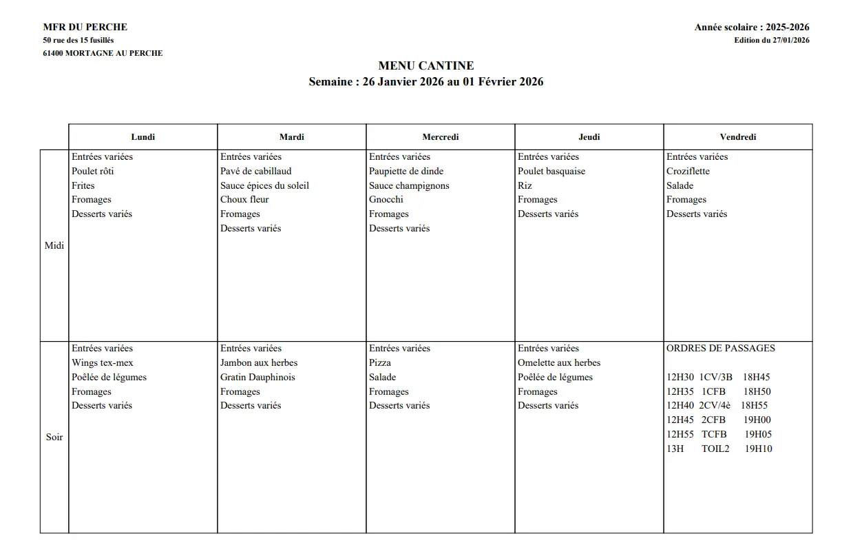 Découvrez le menu de cantine de la semaine du 26 au 30 Janvier : repas équilibrés, plats variés et informations pratiques pour tous les élèves.
