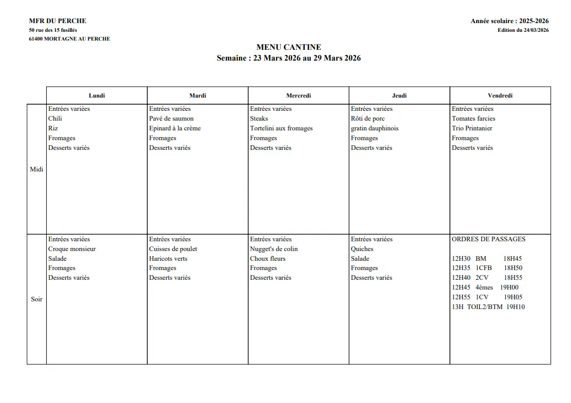 Découvrez le menu de cantine de la semaine du 05 au 09 Janvier : repas équilibrés, plats variés et informations pratiques pour tous les élèves.